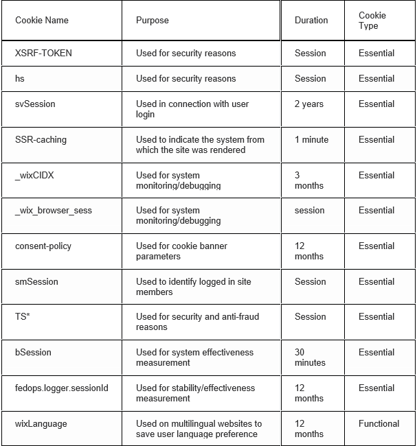 In general, the cookies which are initially placed on our website may be categorised as essential cookies. You can view the table of cookies Wix.com place on our Wix hosted site below and at: https://support.wix.com/en/article/cookies-and-your-wix-site